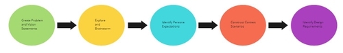 The requirements stage deals with brainstorming everything the app needs before the prototyping begins. The requirements are the data and functional needs of the persona. There are five steps involved: creating a problem and vision statement, exploring and brainstorming, identify persona expectations, construct context scenarios, and identify design requirements.